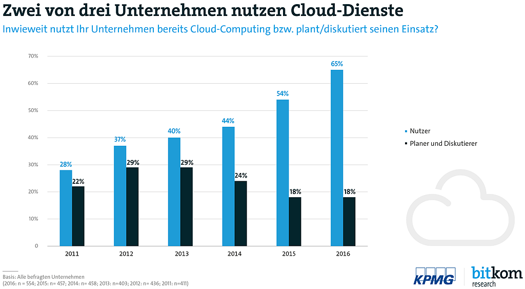 Die „Cloud“ ist in aller Munde. Die Nutzung von Cloud Computing boomt: Laut der Studie „Cloud Monitor 2017“ von KPMG und Bitkom Research setzten 2016 bereits zwei Drittel der deutschen Unternehmen auf Cloud Computing und Cloud Lösungen (vgl. Grafik). Zum Vergleich: 2011 waren es lediglich 28 Prozent der Unternehmen. Wer glaubt, Cloud Computing sei ausschließlich ein Thema für größere Unternehmen und Konzerne, der irrt: Laut der Bitkom Befragung legen bereits gut 64 Prozent der mittelständischen Unternehmen mit 20 bis 99 Mitarbeitern ihre Daten virtuell in der Cloud ab und nutzen Cloud-Lösungen.